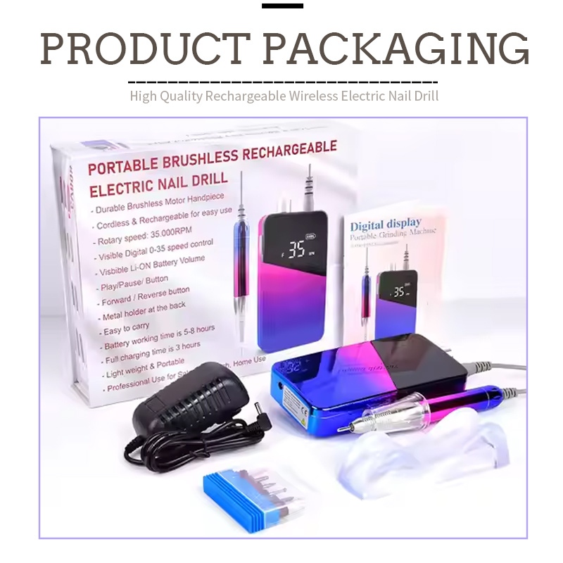התוכן של חבילת מקדחת ציפורניים חשמלית זו של 30,000 סל"ד זו כוללת מוצר עט שיוף, כבל טעינת USB, מדריך הוראות למוצר, וקופסה קלת משקל וניידת.