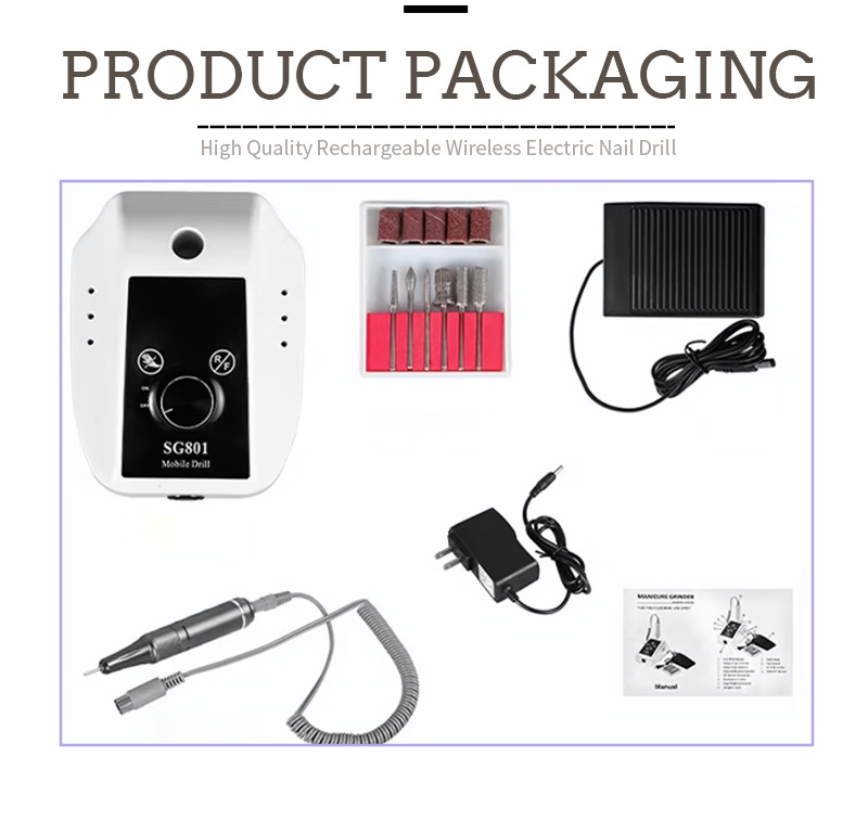 התוכן של חבילת מקדחת ג'ל ניידת חשמלית זו לציפורניים 35,000 סל"ד כוללת מוצר עט שיוף, כבל טעינת USB, מדריך הוראות למוצר, וקופסה קלת משקל וניידת.