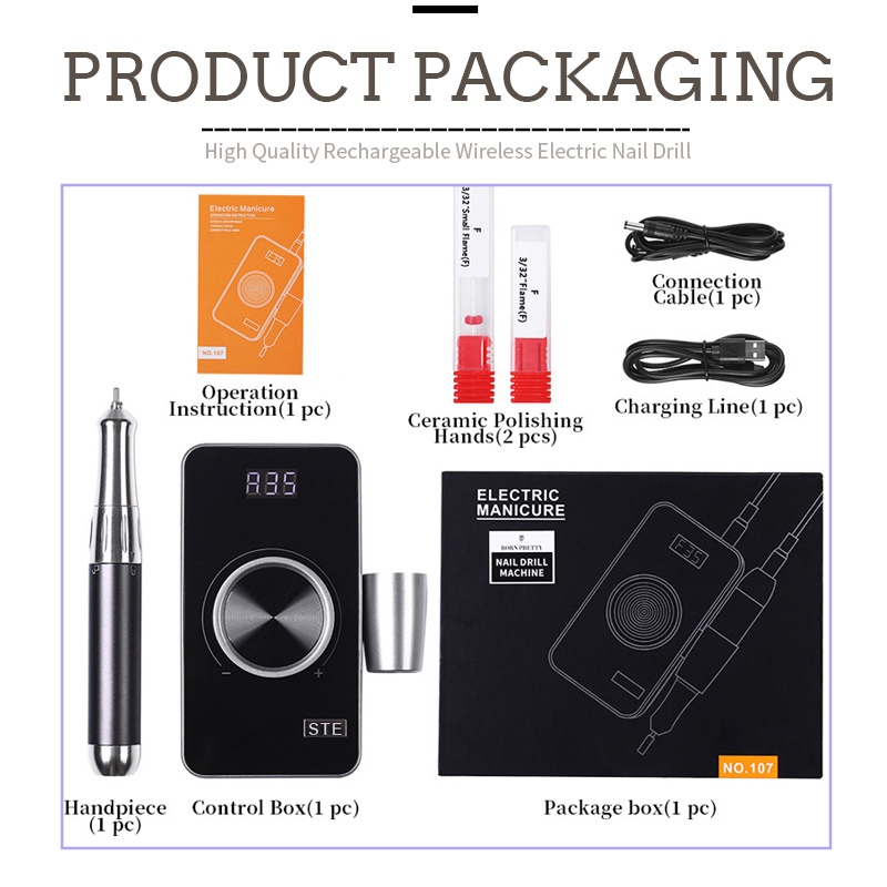 התוכן של חבילת מקדחת ציפורניים חשמלית זו של 35,000 סל"ד מתקלפת זו כוללת מוצר עט שיוף, כבל טעינה USB, מדריך הוראות למוצר, וקופסה קלת משקל וניידת.