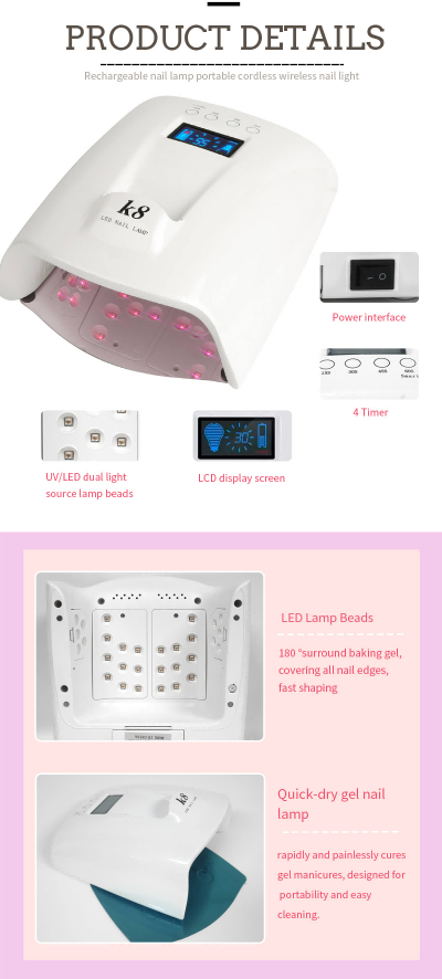 מנורת ייבוש ציפורניים בעלת קיבולת גדולה עם ידית מבטיחה ייבוש אחיד של הדבק ללא התכווצות. מקורות האור הכפולים שלו מספקים חימום עדין למניעת שינוי צבע הידיים ומאמץ בעיניים, מתאים הן לידיים והן לרגליים, ומספק תוצאות ייבוש מהירות להפליא.