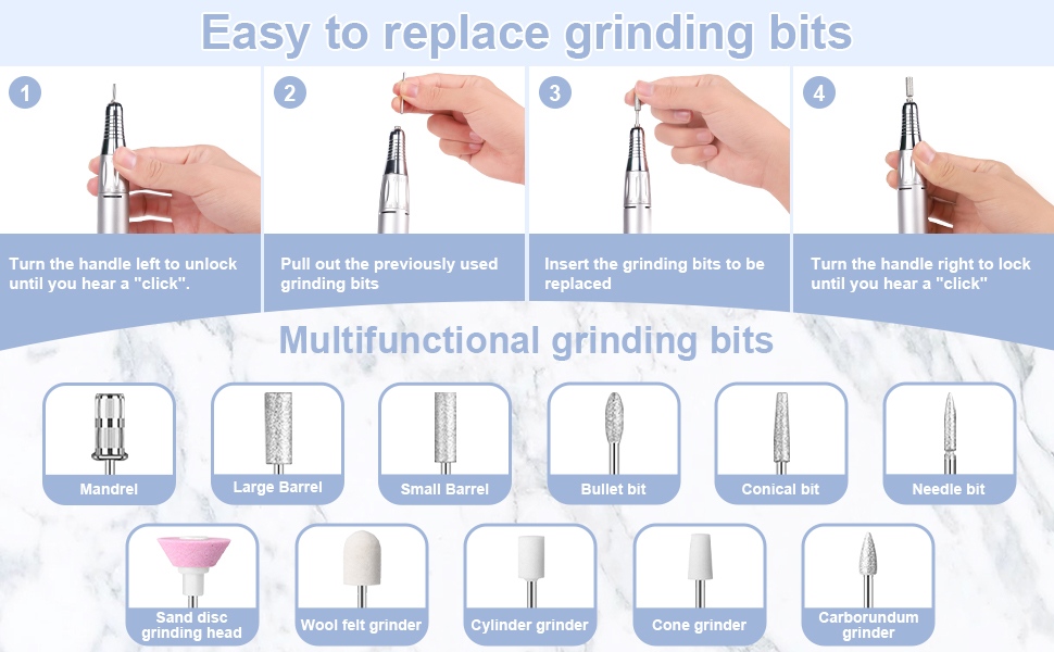 עיצוב התצוגה של ערכת קידוח ציפורניים ניידת זו עם רעש נמוך כולל מתג הפעלה/כיבוי וסיבוב קדימה/אחור עבור סך של הפעלה בלחצן אחד, שקע טעינה מהירה בתחתית, שקע מקדחה להחלפה בחלק העליון ומהירות מתכווננת לשלושה מצבים כדי לענות על מגוון צרכים.