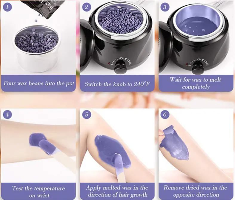 שיטת פעולת השעווה של המוצרים, ככל שהטמפרטורה גבוהה יותר ככל שהשעווה נמסה מהר יותר, כך הטמפרטורה נמוכה יותר ככל שהשעווה נמסה איטית יותר, שופכים תחילה לכמות המתאימה של שעועית שעווה מצולמת, חימום עד לשעועית השעווה נמלטים, ואז חלקים המכלאיים של השעווה המצופה האחיד, ולבסוף כנגד כיוון צמיחת השיער קורעים.