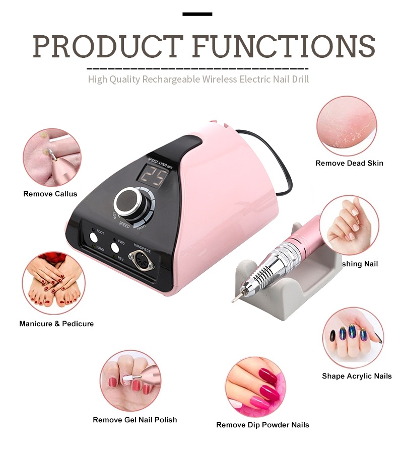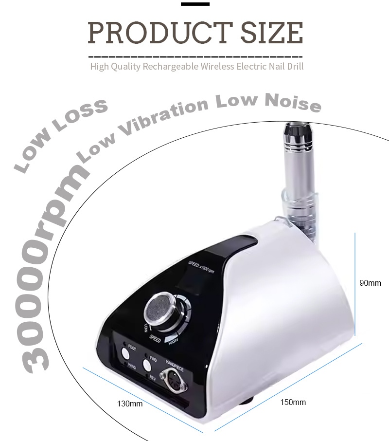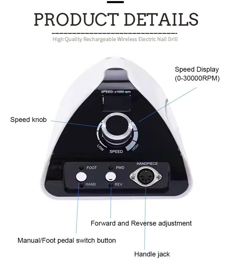 עיצוב התצוגה של מכונת קידוח ציפורניים ניידת מקצועית זו 35,000 סל"ד כולל מתג הפעלה/כיבוי וסיבוב קדימה/אחור עבור סך של הפעלה בלחצן אחד, שקע טעינה מהירה בתחתית, שקע מקדחה להחלפה בחלק העליון ומהירות מתכווננת לשלושה מצבים כדי לענות על מגוון צרכים.
