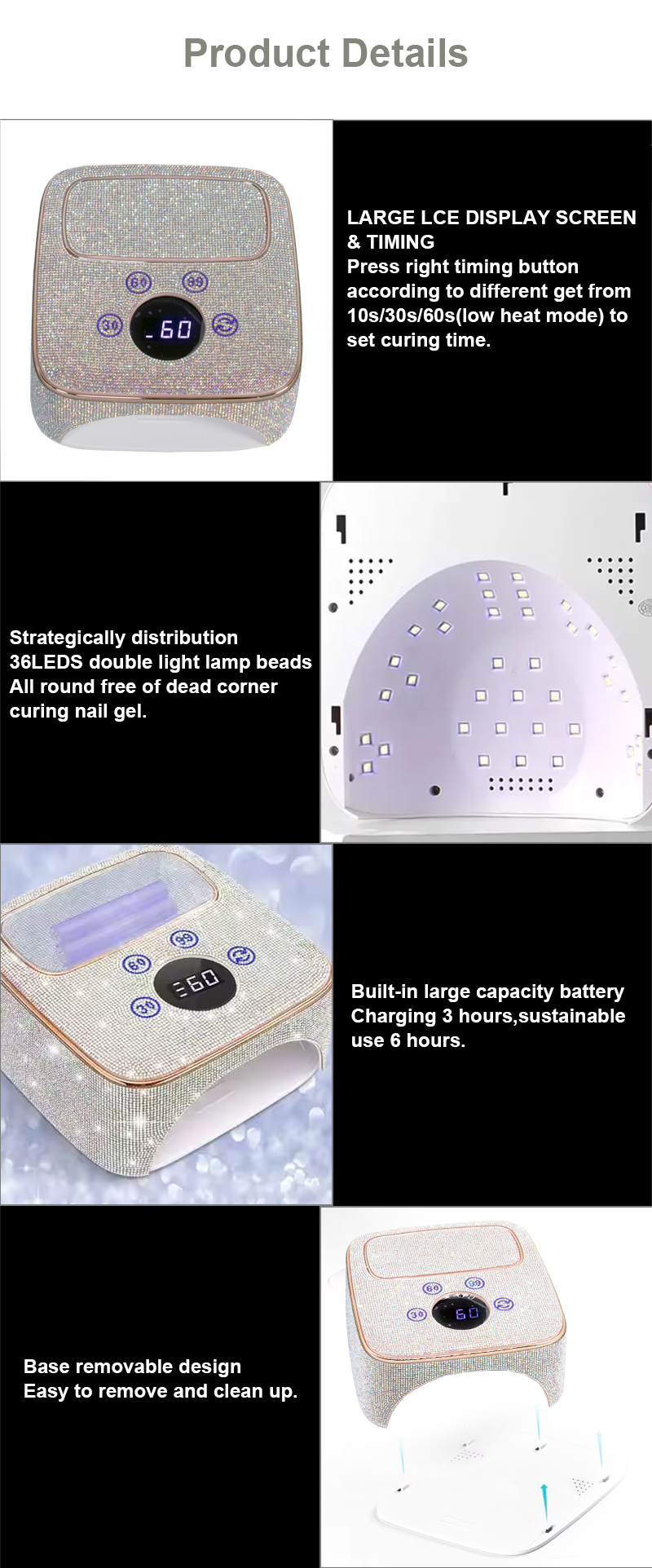 המוצר מבטיח ייבוש אחיד של הדבק ללא התכווצות. מקורות האור הכפולים שלו מספקים חימום עדין למניעת שינוי צבע הידיים ומאמץ בעיניים, מתאים הן לידיים והן לרגליים, ומספק תוצאות ייבוש מהירות להפליא.