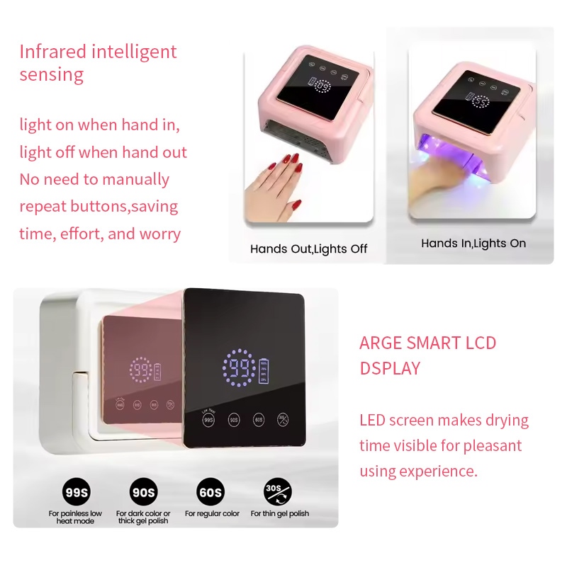 מנורת ייבוש הציפורניים המרובעת כוללת טכנולוגיית חישה חכמה אינפרא אדום הנדלקת אוטומטית כאשר הידיים מתקרבות וכבה כאשר הידיים מתרחקות - מבטל את הטרחה של לחיצה חוזרת על כפתורים וחוסך זמן ומאמץ. דבק אפייה בעל עוצמה גבוהה אינו דורש המתנה ממושכת, וחוסך זמן ומאמץ כאחד.