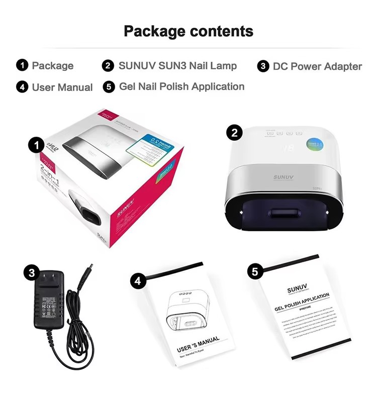 1)סלון ציפורניים נטען UV מייבש אור 48W חבילת מוצר מגיעה עם מדריך, תקע מטען, כבל טעינה, מנורת ציפורניים.