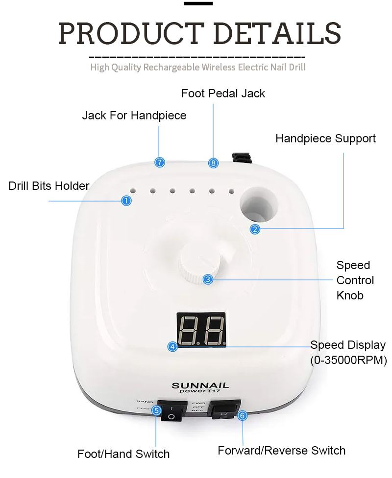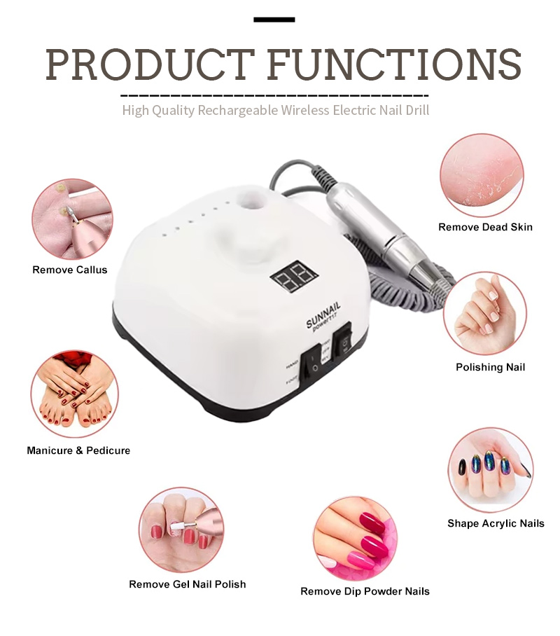 סט מקדחי ציפורניים נטענים מקדח ציפורניים על בהונות אצבעות 35 ואט 35000 סל"ד