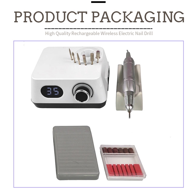 התוכן של מקדחה חשמלית אלחוטית זו לציפורניים עם חבילת 35,000 סל"ד כוללת מוצר עט שיוף, כבל טעינה USB, מדריך הוראות למוצר, וקופסה קלת משקל וניידת.